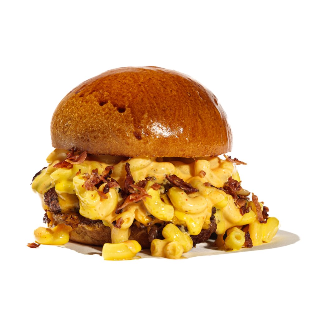 2x hovězí, čedar, makarony v sýrové omáčce, slanina, sriracha majonéza