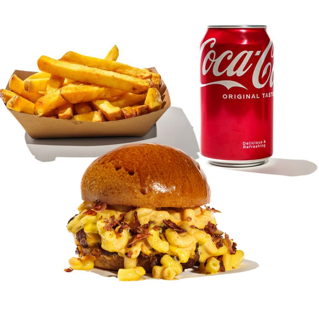 Mac'N'Cheese burger + příloha (hranolky nebo coleslaw) + nápoj