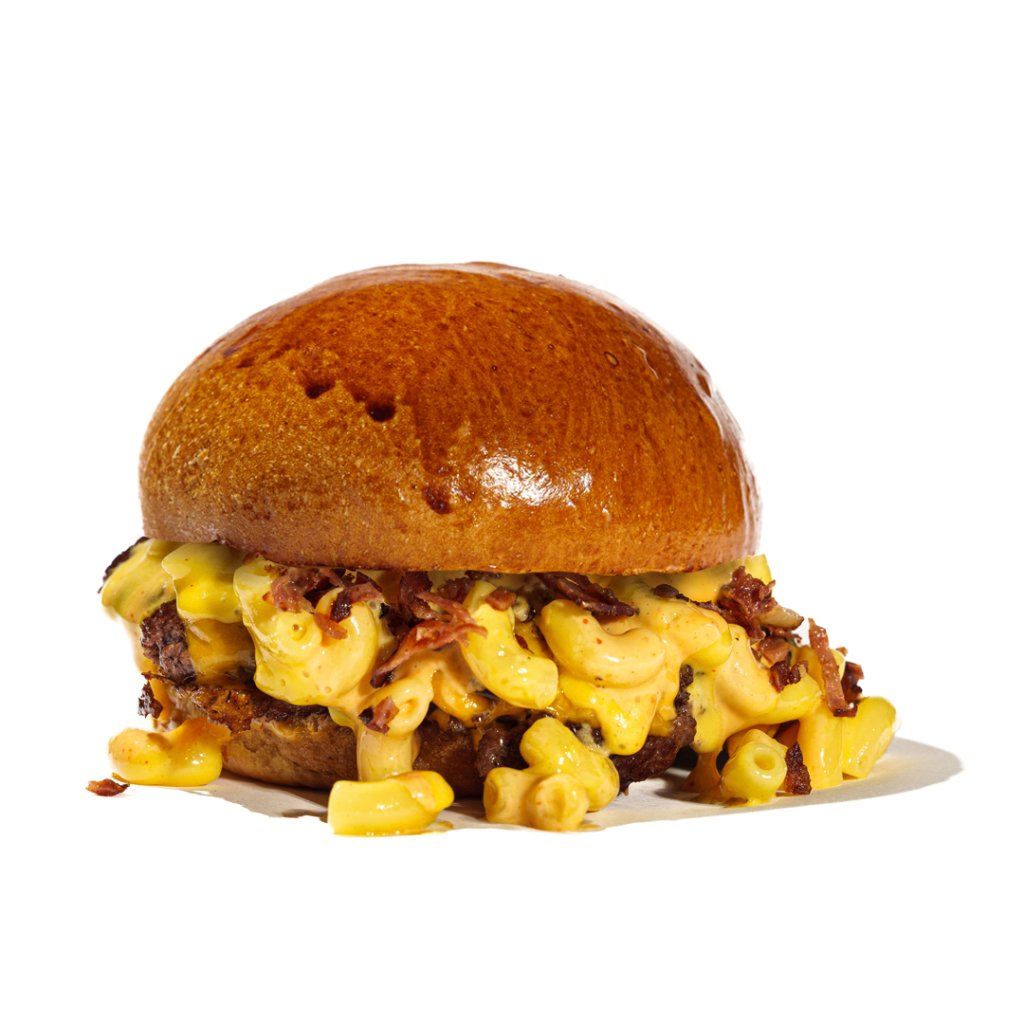 1x hovězí, čedar, makarony v sýrové omáčce, slanina, sriracha majonéza